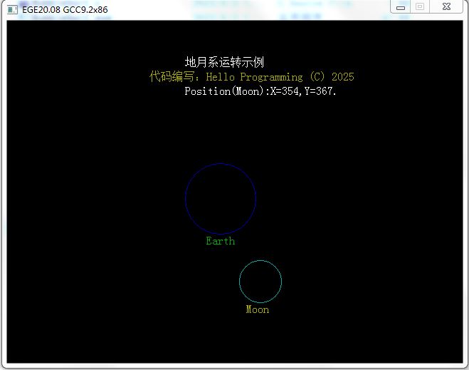 之前看到Turbo C内置的模拟时钟程序看上去很有趣。闲的无事,自己也打算做一个像模拟时钟那样会动的。所以利用了C++的graphics.h头文件实现一个地月系运转的模拟小程序(即月亮围绕地球转动),程序效果如下。